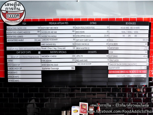 แนวคิดของที่ร้านนี้เหมือนกับประเทศอังกฤษเลยคือฟิชแอนด์ชิปส์สำหรับที่อังกฤษเป็น Street Food สั่งแล้วใส่กล่องไปนั่งทานที่ไหนก็ได้คล้ายๆข้าวตามสั่งใส่กล่องบ้านเรา วิธีการสั่งอาหาร-การจัดเสิร์ฟของที่ร้านนี้จึงมีความไม่เหมือนกับร้านอาหารอังกฤษในประเทศไทยทั่วไป เริ่มจากการสั่งอาหารร้านนี้ใช้ระบบ Fast Food ลงมาสั่งก่อนแล้วจ่ายเงินให้เรียบร้อยส่วนอาหารจะไปเสิร์ฟที่โต๊ะทีหลัง หมวดแรกคือเมนู Fish & Chips ก็มีปลาให้เลือกหลากหลายชนิดทั้ง Cod (ปลาคอด) / Haddock (ปลาแฮดด็อค) / Sea Bass (ปลากะพง) / Halibut (ปลาตาเดียว) ชุบด้วยแป้งผสมเบียร์ราคาเริ่มต้นที่ 330-440 บาท ในชุดเสิร์ฟพร้อมกับมันฝรั่งทอด/เลมอนและซอสเลือกได้แค่ 1 จากเมนูหมวดถัดไปคือ "Chip Shop Chips" ราคา 110 บาทเป็นมันฝรั่งทอดเปล่าๆไว้ทานคู่กับซอสสูตรพิเศษของที่ร้านเลือกได้ 6 รสชาติก็คือ ทาร์ทาร์ซอส/สไปซี่ชีส/หัวหอมชีส/วาซาบิมาโย/ศรีราชามาโยและเจแปนนีสมาโย นอกจากนี้ยังมีเมนูพายอบไส้เนื้อวากิว-หัวหอม/ไส้อกไก่ผสมต้นหอมและแฮม/ไส้แกงไก่มาซาล่า/ไส้เนื้อแกะอบโรสแมรี่/ไส้กรอกยักษ์ม้วนแป้งพายราคา 150-185 บาท หากต้องการชุดเครื่องเคียงทานคู่กับพายประกอบไปด้วยมันฝรั่งทอด/ผักและน้ำเกรวี่ (โดยน้ำเกรวี่จะให้ฟรี 1 ถ้วยอยู่แล้วเมื่อสั่งพายอบทุกไส้) ราคา 120 บาท เครื่องเคียงนั้นมีทั้งถั่วลันเตาบด/ถั่วอบ/เคอรรี่ซอส(แบบเดียวกับในเคอรรี่วูสต์เยอรมัน)/หอมใหญ่ดองหรือเพิ่มดิปซอสราคา 25-60 บาท นอกจากเมนูของทอดแล้วที่ร้านยังมีอาหารยุโรปอื่นอีกทั้งมักกะโรนี 3 ชีส/ลาซานญ่าหมู/ไส้กรอกชุบแป้งทอดสไตล์อังกฤษ/สลัดตามฤดูกาลราคา 110-290 บาท ของหวานมีพายแอปเปิ้ล/พายเชอรี่และช๊อกโกแลตยี่ห้อ Mars ชุบแป้งทอดราคา 75-140 บาท นอกนั้นเป็นเครื่องดื่มและแอลกอฮอลล์ราคา 45-480 บาท เมนูเด็ดอย่างสุดท้ายของที่ร้านคือมิลค์เชค 3 รสชาติ (ช็อกโกแลต/วนิลา/สตรอเบอรี่) แก้วละ 95 บาท ถ้าใครคิดว่าฟิชแอนด์ชิปส์ของที่ร้านนี้ยังแพงอยู่สั่งชุด Lunch ราคา 165 บาทได้ปลาคอคชิ้นเล็ก+มันฝรั่งทอด+ซอสดิป 1 อย่างส่วนเครื่องดื่มเลือกได้ว่าจะเอาน้ำอัดลมหรือมิลค์เชคแก้วเล็กฟรี เฉพาะวันจันทร์-ศุกร์เวลา 11.00-15.00 น. ช่วงเวลาที่มีคนเยอะระหว่างรอก็ดูเมนูที่กำแพงร้านได้พลางๆ โทรถามผู้รู้ก่อนว่าควรสั่งอะไรดีจากนั้นจ่ายเงินและไปนั่งโต๊ะกันครับ