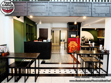 เปิดประตูเข้ามาภายในร้านบรรยากาศและการตกแต่งเน้นกลิ่นอายความเป็นจีนโบราณเริ่มต้นจากพื้นกระเบื้องที่เลือกแบบพิมพ์ลายสีขาว-ดำวางโครงสร้างให้เรียงกันอย่างสวยงามเลียนแบบพื้นหินขัด ส่วนโต๊ะและเก้าอี้ที่ใช้เป็นโครงเหล็กดำปูด้วยไม้ทาเคลือบเงาสีเข้มดูเป็นโทนเดียวกัน เพิ่มความหรูหราย้อนยุคด้วยประตูเหล็กยืดเก่าเอามาทาด้วยสีทองวางบนกำแพงอิฐสไตล์ Loft ทาด้วยสีเขียวมรกตตามธีมร้านมีเสน่ห์ไม่เหมือนใคร พร้อมไฟ LED โทนส้มให้ความอบอุ่นชวนนั่งสบาย (ถึงแม้เก้าอี้จะเล็กนั่งลำบากไปหน่อยก็ตาม) เปิดเครื่องปรับอากาศเย็นฉ่ำและยังติดตั้งพัดลมเพดานขนาดใหญ่ช่วยกระจายลมได้อย่างทั่วถึงทั้งร้าน ส่วนชั้น 2 เห็นทางร้านว่ายังตกแต่งไม่เสร็จดีจึงไม่เปิดให้ขึ้นไปถ่ายรูปด้านบน โดยรวมทำให้นึกถึงตึกแถวหรือบ้านคนจีนในสมัยก่อนที่ถูกนำมาเล่าใหม่สวยงามร่วมสมัยยิ่งขึ้น ตอนที่เรามาถึงเป็นช่วงบ่ายจึงโล่งไม่มีลูกค้าคนอื่น (แต่เดลิเวอรี่วิ่งเข้าตลอด) เลือกที่นั่งกันได้ตามใจเลยครับผม