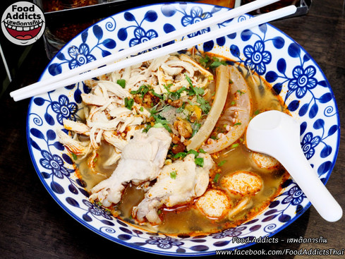 เมนูต่อมาก็เป็น Signature อีกอย่างที่มาแล้วห้ามพลาดคือ "ก๋วยเตี๋ยวไก่ต้มยำ" ไซส์พิเศษราคา 60 บาท เราสั่งมาเป็นเส้นเล็ก ภายในชามเต็มไปด้วยเครื่องแน่นๆทั้งปีกบนไก่ตุ๋นจนเนื้อนุ่มล่อนออกจากกระดูก 2 ชิ้น/ลูกชิ้นหมูเนื้อเด้ง 3 ลูก/ปลาหมึกกรอบชิ้นใหญ่กรุบกรอบเคี้ยวเต็มคำ 2 ชิ้น และเนื้ออกไก่ต้มฉีกเป็นเส้นกินพื้นที่ไปประมาณ 1 ใน 3 ของชามทั้งหมดโรยหน้าด้วยพริกไทย/ผักชีกับต้นหอมซอยและกระเทียมเจียว เริ่มชิมจากน้ำซุปเบสเป็นกระดูกไก่กับหัวไชเท้าอูมามิปรุงใหม่มาเป็นต้มยำเผ็ดกลางครบรสทั้งเค็มหวานเปรี้ยวหอมกลิ่นน้ำมะนาวเคล้าถั่วลิสงคั่วกลมกล่อมแบบไม่ต้องใส่อะไรเพิ่ม เส้นเล็กที่ทางร้านเลือกใช้ลวกสุกแล้วใสเรียงเส้นสวยงาม-ไม่เปื่อยยุ่ยหรือจับตัวเป็นก้อนแสดงถึงการใช้ยี่ห้อที่มีคุณภาพดี (ซึ่งหายากมาก) โดยรวมเมื่อเทียบกับรสชาติและปริมาณที่ได้รับบอกเลยว่าสมควรสั่งเป็นอย่างยิ่ง ถ้ามากับแฟนหรือเพื่อนที่ไม่ชอบทานขาหมูก็มาโซ้ยก๋วยเตี๋ยวไก่แทนก็ถือว่าคุ้มค่าแล้วครับ
