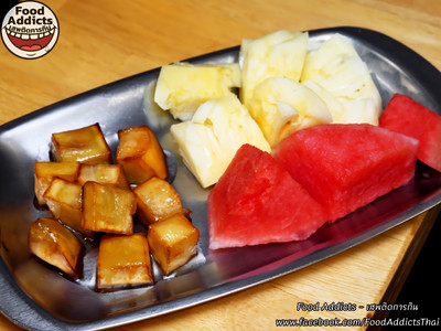 นั่งฟินกับต๊อกโปกีหม้อไฟร้อนๆพร้อมอาหารเกาหลีพร้อมทานอีกหลากหลายเมนูไปเรื่อยๆแต่อย่าลืมเหลือพื้นที่ในกระเพาะเอาไว้รองรับความอร่อยอีกอย่างนั่นก็คือ "ข้าวผัดเกาหลี" โดยเดินไปตักข้าวสวยญี่ปุ่น/ไส้กรอกหั่นเต๋า/กิมจิ/หัวไชเท้าดอง/ข้าวโพดหวานและสาหร่ายเส้นมาเตรียมรอไว้ อย่าลืมเหลือซอสไว้อีกนิดหน่อยสำหรับคลุกผสมทุกอย่างให้เข้ากันซึ่งรวมความอร่อยกับรสชาติอูมามิของวัตถุดิบทั้งหมดที่ทานมาเคล้าในข้าวพร้อมผัดให้แห้งจนเข้มข้นเคลือบทั้งเมล็ด ถ้าในหม้อยังคงเหลือเนื้อสัตว์หรือผักชิ้นใหญ่สามารถใช้กรรไกรช่วยตัดเป็นชิ้นเล็กๆก่อนผัดข้าวจะเข้ากันได้ดีมากกว่า อิ่มแล้วก็ปิดท้ายด้วยขนมหวานซึ่งมีให้หยิบฟรีในไลน์ทั้ง 1. แตงโมสีแดงเนื้อแน่นฉ่ำหวานเม็ดน้อยกินง่าย 2. สับปะรดเนื้อหวานกรอบผสมฉ่ำหวานอมเปรี้ยวกำลังดีกัดแล้วไม่แสบปาก 3. มันหวานเชื่อมหั่นทรงลูกเต๋าขนาดเล็กทอดแล้วเชื่อมด้วยคอร์นไซรัปหรือน้ำเชื่อมข้าวโพดเกาหลีรสหวานมันเคี้ยวหนึบสู้ฟันให้ตักอีกไม่อั้น ซึ่งตลอด 90 นาทีที่ผ่านมาเราได้รับประสบการณ์ความฟินตามแบบฉบับเกาหลีอย่างเต็มที่แล้ว ส่วนสุดท้ายอย่าลืมเครื่องดื่มรีฟิลต่างๆซึ่งรวมอยู่ในราคาบุฟเฟ่ต์คนละ 299 บาทเรียบร้อยแล้วจะมีอะไรให้กดบ้างไปรับชมกันเลยครับ
