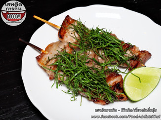 เมนูต่อมาก็ยังคงเป็นการถนอมอาหารแบบโบราณอย่าง "ข้าวทอดยำปลาอินทรีแม่กลองเค็ม" ราคา 165 บาท เป็นเนื้อปลาอินทรีเค็มบดผสมกับข้าวสวยพริกสดและใบมะกรูดปั้นเป็นก้อนแล้วนำไปทอดด้านนอกกรุบกรอบส่วนด้านในเคี้ยวหนึบหอมกลิ่นข้าวหอมมะลิผสมปลาอินทรีเค็มอ่อนๆรสเผ็ดนิดๆหอมเครื่องสมุนไพรทานเล่นได้อร่อยดี จานต่อไปเป็นเมนูชื่อง่ายๆแต่ทางร้านมีการนำเสนอที่ไม่เหมือนใครอย่าง "หมูปิ้ง" เสิร์ฟ 2 ไม้ราคา 125 บาท ก็เป็นหมูปิ้งนมสดสลับชั้นเนื้อ-ไขมันตามแบบที่เราคุ้นเคยแต่ถ้าทานเปล่าๆอาจจะรู้สึกเลี่ยนเกินไปที่ร้านก็เลยท๊อบปิ้งด้วยใบชะพลูซอยละเอียดเรียงเป็นแนวยาวตัดความเลี่ยนด้วยมะนาวบีบลงไปก่อนทาน ทำให้ได้ความเปรี้ยว-หวานและหอมใบชะพลูในปากคล้ายกับการทานเมี่ยงในรูปแบบเสียบไม่ทานง่ายๆไม่ต้องห่อเองให้เลอะมือแปลกใหม่ดีครับผม