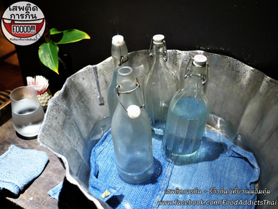 กลับมานั่งที่โต๊ะก็ยังคงมีความเป็นไทยตั้งแต่กระดาษรองจานสีสันต่างๆไม่ซ้ำกันก็ใช้ลายไทย/จานเป็นสังกะสีสีขาววาดลาดแบบโบราณ แต่ยังคงความสมัยใหม่ด้วยแก้วไวน์และแก้วใส่น้ำเปล่าตามมาตรฐานร้าน Fine Dinning เอาไว้เช่นเดิม ส่วนปิ่นโตสีขาวตรงกลางโต๊ะเป็นที่ใส่กระดาษทิชชู่พับเอาไว้อย่างสวยงามพร้อมใช้งาน เครื่องดื่มหากคุณไม่สั่งก็ไม่ต้องกลัวเหือดแห้งเพราะเขามีบริการน้ำดื่มให้ฟรีแต่มันมีจุดให้ตื่นเต้นคือเลือกได้ว่าจะทานเป็นน้ำเปล่าหรือ Sparkling Water เพราะถ้าไปซื้อที่ร้านหรือซุปเปอร์มาร์เก็ตขวดนึงราคาแพงมากแต่ที่นี่ดื่มได้ไม่อั้น มันก็คือน้ำเปล่าที่เพิ่มก๊าซคาร์บอนไดออกไซด์ลงไปให้ความซ่าสดชื่นแต่ไม่มีรสชาติเป็นที่นิยมในหมู่ชาวต่างชาติ ก็พอทราบแล้วว่ากลุ่มลูกค้าหลักของที่นี่เป็นใคร แต่รสชาติอาหารจะเข้มข้นแบบไทยหรือไม่เรามาเริ่มสั่งอาหารกันเลยครับผม