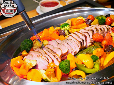 เริ่มสำรวจไลน์อาหารกันครับ ที่นี่มีให้เลือกทานค่อนข้างหลากหลายเมนู โซนแรกเป็นเหมือนอาหารทานเล่นทั้งไทยและฝรั่ง "กุ้งผัดหน่อไม้ฝรั่งซอสมาโย" กุ้งตัวขนาดกลางเนื้อเด้งผัดกับหน่อไม้ฝรั่งกรุบกรอบเพิ่มความหอมมันด้วยมายองเนสปรุงรสเปรี้ยว เผ็ดนิดๆ ทานได้เรื่อยๆ เมนูถัดมาเป็น"เป็ดอบซอสส้ม" อกเป็ดเนื้อแน่นติดหนัง ย่างจนสุกสีชมพูกำลังดี ราดด้วยซอสส้มรสเปรี้ยวหวานหอมกลิ่นส้ม ช่วยตัดความคาวของเป็ดได้เป็นอย่างดีเลยครับ