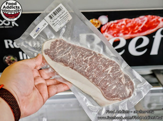 ใครเป็นสายเนื้อวัวตัวจริงแวะมาร้าน "Food Identity" (ฟู้ดไอเดนติตี้) รับรองว่าไม่ผิดหวังเพราะเขาพยายามนำเข้าหลากหลายสายพันธุ์ทั่วโลกวางเรียงเต็มตู้แช่แข็งให้ลูกค้าเลือกตามใจเช่น USA สหรัฐอเมริกา / Australia ออสเตรเลีย / New Zealand นิวซีแลนด์ / Argentina อาร์เจนตินา / France Charolais ชาร์โรเลส์,ฝรั่งเศส Japanese ดินแดนอาทิตย์อุทัย / Thai Wagyu พัฒนาโดยเกษตรกรพื้นบ้านเราทั้งเกรด Grain Fed รับประทานธัญพืชและ Grass Fed วิ่งเล่นกินหญ้าล้วนๆจึงมีปริมาณไขมันแทรกไปจนถึงกลิ่นเฉพาะตัวแตกต่างกันบรรจุลงถุงพลาสติกหนาพิเศษผนึกด้วยระบบสุญญากาศใช้เวลาละลายผ่านน้ำอุณหภูมิห้องก่อนย่างเสิร์ฟอย่างน้อย 15 นาที สามารถกำหนดได้รวม 5 ระดับความสุก 1. Rare ค่อนข้างดิบเถื่อน 2. Medium Rare ผิวนอกสุกภายในแดง 3. Medium อมชมพูนิดหน่อย 4. Medium Well ชุ่มฉ่ำกำลังพอดี 5. Well Done เกรียมแน่นอน 100% สำหรับวันนี้เราหยิบ "Wagyu Striploin MS 4-5" ขนาด 212 กรัมราคา 909.48 บาท บริเวณสันนอกลูกครึ่งญี่ปุ่นออสฯโรยเกลือหิมาลายันสีชมพู-พริกไทยดำปิ้งบนกระทะเหล็กหล่อดำสนิทราดเนยใส่ก้านสมุนไพรโรสแมรี่สดเพื่อดับคาวจิ้มเกรวี่ตะวันตกสลับแจ่วอีสานเคียงเห็ดออเร็นจิเนยกระเทียม,มะเขือเทศอบสมุนไพร,มันฝรั่งบดเนียนละเอียดครับ