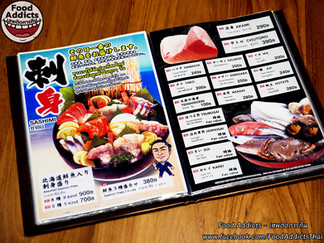 จัดการเลือกโต๊ะที่อยากนั่งให้เรียบร้อยโดยจะมีเล่มเมนูวางเอาไว้ชวนเราเปิดเพื่อสั่งอาหารได้อย่างรวดเร็วทันใจประจำจุดต่างๆ เริ่มต้นด้วยหน้าแรกคือหอยนางรมสด-ย่างนำเข้าจากเกาะฮอกไกโดใหญ่พิเศษเพียงตัวละ 99 บาท หรือเสิร์ฟคู่กับซอสต่างๆทั้งพริกไทยดำ,วาซาบิสด/น้ำจิ้มซีฟู้ดสไตล์ไทย/พริกจาลาปิโน/เนย,กระเทียม/เบคอน,ชีส/ไซเกียวมิโสะ,พริกป่นดำญี่ปุ่นราคา 109 บาท ตามด้วยหอยเชลล์ฮอกไกโดไซส์ยักษ์ย่างเนยและมิโสะหอยเม่นราคาตัวละ 90-100 บาท หรือสั่ง 10 ฝาย่างสไตล์ชาวประมงญี่ปุ่นเพียง 600 บาท หน้าถัดไปเป็นรายการกับแกล้มมักจะเสิร์ฟในร้านอิซากายะปกติรวมกว่า 14 อย่าง (บางรายการถูกตัดออกชั่วคราวเพราะวัตถุดิบหาได้เฉพาะฤดูกาล) ราคา 120-280 บาท สำหรับเมนูย่างและลนไฟยังคงรวมของดีจากฮอกไกโดเอาไว้เหมือนเดิมราคา 90-480 บาท หอยตลับ-หอยรวมหลายๆอย่างต้มสาเกราคา 150-400 บาท / อาหารจานทอดราคา 160-380 บาท สายปลาสีส้มห้ามพลาดกับสารพัดแซลมอนปรุงออกมาเป็นเมนูสุดพรีเมี่ยมต่างๆทั้ง นิกิริปั้นคำ/ซูชิโรลขนาดใหญ่/ข้าวหน้าดงบุริใส่ถ้วย/ท้องย่างบนเตาถ่านสไตล์โบราณแท้ๆและหั่นชิ้นลนไฟกลิ่นหอมๆก่อนเสิร์ฟราคา 220-500 บาทครับผม