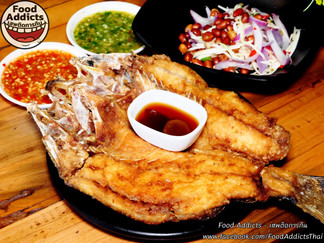 ปกติร้านอื่นจะเสิร์ฟเมนูนี้เป็นชิ้นหรือจำกัด 1 คนต่อตัว แต่ร้านนี้สั่งไปเลยไม่มีลิมิตนั่นก็คือ "ปลากะพงทอดน้ำปลา" ไซส์นี้อย่างน้อยขายในภัตตาคารราคาตัวละ 350 บาท เสิร์ฟพร้อมยำมะม่วงรสเปรี้ยวหวานใส่ถั่วลิสงทอดลงไปแบบจุกๆ ส่วนใครที่ไม่ทานเผ็ดหรือมีเด็กมาด้วยทางร้านเสิร์ฟพร้อมซอสซีอิ๊วขาวรสหวานนำเค็มลอยขิงสดหอมๆให้ทานคู่กันแทน กะพงทั้งตัวที่ว่าแพงแล้วทางร้านยังเอาวัตถุดิบสุดพรีเมี่ยมมาเสิร์ฟอีกอย่างนั่นคือ "ปลาอินทรีแดดเดียวทอด" มาพร้อมซอสซีอิ๊วและยำแบบเดียวกับจานที่แล้ว ปลาอินทรีเนื้อแน่นๆมีไขมันแทรกชุ่มฉ่ำ-รสเค็มกำลังดีเหมาะสำหรับทานกับข้าวสวย-คลุกน้ำยำอร่อยเพลินสุดๆ ต่อกันด้วยของทอดอีกจานที่ประทับใจมากคือ "ปลาหมึกไข่แดดเดียวทอด" เป็นปลาหมึกกล้วยไข่แน่นเต็มท้องเอาไปแดดเดียวให้มีรสชาติเค็ม-กลมกล่อมและกำจัดความชื้นส่วนเกินออกไปก่อนจะนำไปชุบแป้งทอดกรอบ ทานเปล่าๆก็อร่อยหรือสาดน้ำจิ้มซีฟู้ดลงไปก็แซ่บสะใจเป็นอีกจานที่ขอแนะนำเลยว่าต้องสั่งครับ ต่อกันที่ "ปูนิ่มทอดกระเทียม" ซึ่งบอกเลยว่าไม่ใช่ปูนิ่มจากแมคโครแน่นอนเพราะมีเนื้อหวานนิดๆไม่เค็มเข้ากับแป้งทอดกรอบรสเค็มอ่อนๆได้เป็นอย่างดี ถือเป็นอีก 1 วัตถุดิบราคาแพงที่ทางร้านเอามาให้กินไม่อั้นอีกแล้ว "ทอดมันปลาอินทรีย์" เสิร์ฟมา 4 ชิ้นใหญ่เนื้อแน่น-ฉ่ำไขมันราวกับเค้กปลารสหวานเผ็ดถึงเครื่องแกงทานได้ทันทีแบบไม่ต้องเรียกหาน้ำจิ้มเพิ่มแต่อย่างใด ปกติไม่ค่อยชอบทานทอดมันแต่ร้านนี้ทำเอาติดใจเลยครับ