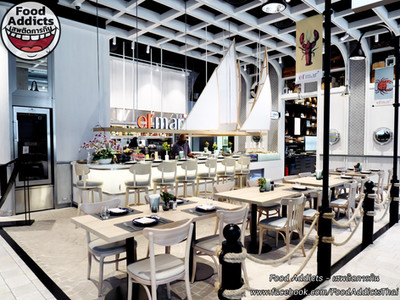 ตามมาด้วยร้านที่ 4 มีชื่อว่า "เอลมาร์" จำหน่ายซีฟู้ดสดใหม่คุณภาพสูงระดับพรีเมี่ยมนำเข้าจากทั่วโลก โดยได้จำลองบรรยากาศทั้งหมดให้คล้ายกับอู่ต่อเรือเก่าๆในหมู่บ้านชาวประมงของประเทศฝรั่งเศส โดดเด่นด้วยบาร์กลางร้านที่ออกแบบราวกับเรือใบขนาดใหญ่จอดเทียบท่าเพื่อขนส่งวัตถุดิบที่เพิ่งจับขึ้นมาจากมหาสมุทรวางเรียงสวยงามบนน้ำแข็งพร้อมติดป้ายราคาแบบเดียวกับแผงตลาดปลาตั้งอยู่ริมทะเล (มีการปรับเปลี่ยนไปในแต่ละวันจึงใช้ป้ายที่สามารถเขียนแล้วลบได้อย่างในรูป) เน้นความปลอดโปร่งโล่งสบายด้วยไฟโทนส้มกับเฟอร์นิเจอร์ไม้สีอ่อนราวกับว่ากำลังนั่งทานซีฟู้ดริมทะเลพร้อมรับแสงแดดนวลตา พร้อมชมเชฟประจำร้านปรุงอาหารให้ชมทุกๆขั้นตอนภายในครัวแบบเปิดโล่งไร้ผนังปกปิดแสดงถึงความมั่นใจในคุณภาพของวัตถุดิบและรสชาติในแต่ละจานได้เป็นอย่างดีเลยครับ