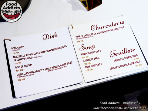 อย่างที่บอกไปเบื้องต้นแล้วว่าร้านนี้เน้น Comfort Food ทานง่ายเข้ากับไวน์ เริ่มต้นด้วยสลัดต่างๆราคาเริ่มต้นที่ 190-320 บาท แซนด์วิชและฮอทด็อกราคาเริ่มต้นที่ 220-430 บาท เมนูจานหลักกินง่ายมีแค่ 4 อย่างราคาเริ่มต้นที่ 240-890 บาท ซุปสไตล์ฝรั่งถ้วยละ 160-220 บาท Charcuterie หรือ ชาร์คูเตอรี เป็นเนื้อตากแห้ง/ชีส/ผลไม้ต่างๆวางบนบอร์ดไม้สไตล์ฝรั่งเศสมีตั้งแต่ขนาดเล็กราคา 120-299 บาท ไปจนถึงขนาดใหญ่ใส่วัตถุดิบรวมกว่า 5 ถึง 8 ชนิดราคาเริ่มต้นที่ 695-990 บาท พร้อมเครื่องเคียงให้กินคู่กันเป็น Side Dish ราคา 60-110 บาท ไปจนถึงของหวานเป็นโยเกิร์ตต้นตำรับและผสมเลมอนกับผลไม้ราคาถ้วยละ 120 บาท สายชีสต้องหลงรักกับถาดรวมชีส 4 ชนิดและ 6 ชนิดราคา 695-990 บาท สุดท้ายเป็นเครื่องดื่มทั้ง ชา/น้ำเปล่า/น้ำแร่/น้ำแร่อัดแก๊สและน้ำอัดลมราคาเริ่มต้นที่ 40-110 บาท ผู้คลั่งไคล้ Cheese กับ Cold Cut ตัวจริงต้องถูกใจร้านนี้อย่างแน่นอนครับผม