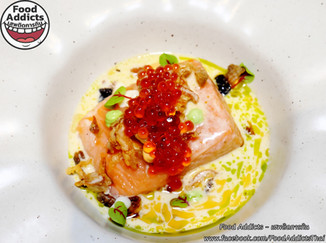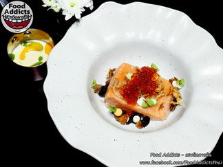 เมนูต่อมาเป็นจากหลักจากร้าน "มีทแอนด์สไปซ์ บายอนาเธอร์ฮาวด์คาเฟ่" เริ่มต้นด้วยเมนูปลาย่อยง่ายๆอย่าง "Salmon Confit in Snow Ocean" ราคา 450 บาท เป็นแซลมอนชิ้นใหญ่ลอกหนังออกก่อนเอาไปตุ๋นในน้ำมันที่เรียกว่ากงฟีต์จนสุกนุ่มชุ่มฉ่ำโดยไม่ทิ้งรสชาติและความหยาบกระด้างของแซลมอนเอาไว้แบบวิธีการปรุงสุกอื่น โดยหนังที่ลอกออกมาก็เอาไปหั่นเป็นชิ้นเล็กๆชุบแป้งทอดกรอบทนนาน ท็อปปิ้งด้วยไข่ปลาแซลมอนที่ให้รสเค็มกับไขมันของปลาแตกระเบิดกระจายในปาก ก่อนทานราดซอสต้มข่าเข้มข้นทำจากกะทิสุดหอมมันปรุงรสให้อมหวานเล็กน้อยลอยด้วยน้ำมันสกัดจากเครื่องสมุนไพรไทยและเปลือกกุ้ง เมื่อทานพร้อมกันกลายเป็นต้มข่าปลาแซลมอนที่ให้สัมผัสแปลกใหม่แต่ถ้าใครไม่ชอบกลิ่นเฉพาะตัวของแซลมอน/มันกุ้งอาจจะไม่ค่อยถูกใจจานนี้เท่าไหร่ครับ เมนูต่อไปถูกยกออกมาจากร้านอาหารอีสานบ้านๆให้ถึงโต๊ะก็คือ "Rib-Eye Khaojee E-Sarn" ราคา 1,150 บาท เป็นเนื้อส่วนริปอายนำเข้าออสเตรเลียย่างสุกแบบ Medium Well (ถ้าใครอยากให้สุกหรือดิบกว่านี้ก็สั่งได้ตามใจ) หั่นมาชิ้นใหญ่หนาเคี้ยวเต็มคำรสชาติและกลิ่นเนื้อจัดจ้านหอมเตาถ่าน เสิร์ฟพร้อมแจ่วปลาร้าเผ็ดกลางกลมกล่อมและข้าวจี่ย่างที่สอดไส้ตรงกลางด้วยน้ำพริกแบบเดียวกับในถ้วย ตัดเลี่ยนไขมันของเนื้อด้วยมะเขือเทศลูกกลมย่างโรยเกลือรสชาติหวานอมเปรี้ยวอีกหน่อยอร่อยลงตัวดีมาก ใครชอบเนื้อวัวย่างจิ้มปลาร้าแบบอีสานสุดนัวต้องชอบจานนี้แน่นอนครับ