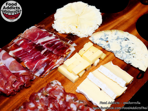 ของคาวสำหรับนั่งดื่มคู่กับไวน์ชิลๆอย่างสุดท้ายมาจากร้าน "เอวรีล กูร์เมต์ แอนด์ บอร์ดิเยร์ ซีเล็กชั่น" ที่เสิร์ฟ Cold Cut และ Cheese เป็นถาดเมนู "Deluxe Selection Of 5 Cold Cut Small Size" ราคา 695 บาท นี้มีวัตถุดิบพรีเมี่ยมรวมกัน 5 อย่างคือ 1. Classic Dry Sausage หรือไส้กรอกตากแห้งผสมเครื่องเทศสไลด์บางกินง่ายไม่เค็มนัก 2. Homemade Mortadella หรือโบโลนญ่าแบบที่เรารู้จักเนื้อนุ่มสัมผัสเนียนละเอียด 3. Chorizo Iberico De Bellota เป็นไส้กรอกตากแห้งทำจากเนื้อหมูอิเบริโก้ผสมพริกรมควันและกระเทียมมีรสชาติเค็ม-เผ็ดเล็กน้อย 4. Prosciutto Parma Ham 24 Months เป็นแฮมจากเมืองพาร์มาทางตอนเหนือของประเทศอิตาลีที่ถูกตากแห้ง-บ่มเอาไว้นานกว่า 2 ปีรสชาติเค็มนวลกลมกล่อมหอมกลิ่นไขมันหมูเฉพาะตัว 5. Paleta Iberico De Bellota Dop Reserva 2017 เป็นแฮมบ่มตั้งแต่ปี 2017 จากหมูสายพันธุ์พิเศษ Iberico ของสเปนมีรสชาตินุ่มนวลคล้ายแฮมขาหมูแบบร้านอาหารจีนทานง่ายไม่เค็มอย่างที่คิด ชีสอีก 4 ชนิดที่ทางร้านรวมมาในถาดเดียวนั้นก็คือ "Deluxe Selection Of 4 Cheese Small Size" ราคา 695 บาท ประกอบด้วย 1. Truffle Gouda Aop หั่นมาเป็นชิ้นหนารสชาติเค็มสัมผัสเข้มข้นมีกลิ่นเฉพาะตัวกลางๆ 2. Tete De Moine Aop ชีสทรงกระบอกเนื้อแข็งใช้เครื่องจีรอลมาขูดชีสให้เป็นดอกไม้บางๆรสเค็มหอมนุ่มนวล 3. Fourme d'Ambert Aop เป็นชีสเนื้อแข็งรสเค็มมีเชื้อราและกลิ่นรุนแรงเฉพาะตัว 4. Brie De Meaux Aop เป็นชีสสีขาวเนื้อสัมผัสเนียนนุ่มขอบด้านนอกแข็งมีกลิ่นหมักฉุนขึ้นจมูกเล็กน้อย อีกจานก็คือ "Pate En Croute With Foie Gras" ราคา 299 บาท เป็นพายอบชิ้นใหญ่สอดไส้ตับห่าน-เป็ด/เนื้ออกไก่/เนื้อหมูยัดไส้พิสตาชิโอ-แครนเบอรี่และน้ำเชื่อมผสมบรั่นดีเรียงกันเป็นชั้นๆสวยงาม แก้เลี่ยนด้วยพริก/เคเปอร์/แตงกวา/หอมใหญ่ดองและมัสตาร์ต มาพร้อมขนมปังก้อนสีขาวอบเนื้อกรอบนอกสัมผัสเหนียวหนึบฟูหอมกลิ่นแป้งสาลีสไตล์ฝรั่งแท้ทานคู่กับชีส-Cold Cut และตับห่านเข้ากันได้ดีกับทุกเมนูที่นำมาเสิร์ฟ