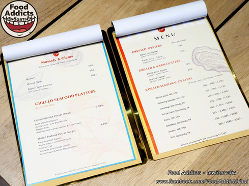เมนูของที่ร้านก็เน้นไปทางซีฟู้ดเป็นหลักเริ่มต้นด้วย คาเวียร์เสิร์ฟละ 15/30 และ 50กรัม มีให้เลือกถึง 3 เกรดราคาเริ่มต้นที่กระปุกละ 1,570-10,285 บาท คาเวียร์ขนาด 5 กรัม เสิร์ฟพร้อมอาหารทั้งหมด 3 เมนู ราคาเริ่มต้น 600-650 บาท หอยแมลงภู่และหอยกาบนึ่งไวน์ขาวราดซอสมะเขือเทศสดราคา 550-680 บาท ซีฟู้ดรวมปรุงสุกจานเล็กกับใหญ่ราคา 2,980-4,895 บาท หอยนางรมทานสดเสิร์ฟเป็นตัวราคา 200-380 บาท หอยนางรมแบบปรุงสุกราดซอสต่างๆราคาเมนูละ 220 บาท หอยนางรมสดแช่เย็นจากภูมิภาคต่างๆทั่วโลกทั้งหมด 8 ชนิด เลือกได้ว่าอยากทานแค่ตัวเดียว-ครึ่งโหล 6 ตัวหรือโหลนึง 12 ตัว ราคาเริ่มต้นที่ 160-3,220 บาท หากไม่ทานของสดก็มีซีฟู้ด-เนื้อย่างเสิร์ฟเป็นจานและต่อ 100 กรัมมาพร้อมซอส 5 ชนิด ราคาเริ่มต้นที่ 285-1,600 บาท เครื่องเคียงไว้ทานคู่กับจานหลักราคา 95-165 บาท เมนูโรล/ข้าวและก๋วยเตี๋ยวพร้อมทานราคา 450-1,070 บาท ซุปสลัดราคา 350-380 บาท จานซีฟู้ดเรียกน้ำย่อยราคา 280-1,070 บาท นอกนั้นเป็นเครื่องดื่มและแอลกอฮอล์ ส่วนใครที่ไม่สะดวกนั่งทานในร้านก็สั่งกลับบ้านหรือช็อปปิ้งสินค้าสำเร็จรูปพร้อมทานนำเข้าจากต่างประเทศได้ที่ตู้เย็นขนาดใหญ่ข้างๆกันก็ได้มีทั้งแยม/โยเกิร์ต/ปลาซาร์ดีนกระป๋องในซอสต่างๆ/Cold Cut/ซอสบรรจุใส่กระปุก/สลัดพร้อมทาน/ขนมปังและเครื่องดื่มแช่เย็น อยากกินอะไรก็หยิบแล้วเดินเข้าไปคิดเงินภายในร้าน "เอลมาร์" ที่อยู่ใกล้กันได้เลยครับ