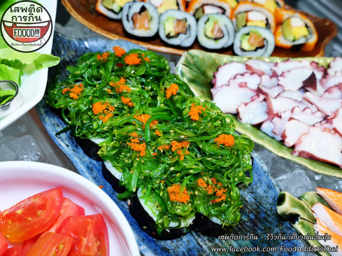 อาหารญี่ปุ่นที่นี่ก็มีให้ทานด้วยนะ เริ่มจากแซลมอนซาชิมิที่แทรกไขมันชั้นใหญ่และมีไขมันแทรกลงไปในเนื้อแบบลายหินอ่อน หวานนุ่มไขมันหอมละลายในปาก อร่อยสุดๆทานได้เรื่อยๆ จะจิ้มโชยุวาซาบิหรือทานกับน้ำจิ้มซีฟู๊ดตามสูตรปลาแซลมอนแช่น้ำปลาสุดแซ่บ ก็ช่วยให้ทานได้อีกหลายจานเลยครับ ปูอัดซาชิมิ/ปลาหมึกทาโกะซาชิมิ รสชาติพื้นๆเป็นไปตามมาตรฐาน ในส่วนของซูชินั้นมีให้ทาน 3 แบบคือซูชิโรลหน้ายำสาหร่ายญี่ปุ่น/แคลิฟอร์เนียโรลใส่ผักดองไว้ด้านใน/โรลแซลมอนมากิใส่อโวคาโดเนื้อมัน ข้าวรสชาติหวานอมเปรี้ยวอัดมาแน่นจนแทบไม่เห็นตัวเมล็ดข้าว แต่มีความเคี้ยวเหนียวหนึบสู้ฟันมาแทน อันนี้ก็แล้วแต่คนชอบนะครับ แต่ส่วนตัวถือว่าเฉยๆ (ไปลุยแซลมอนดีกว่า)