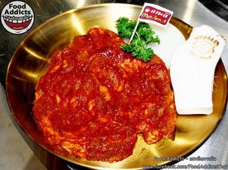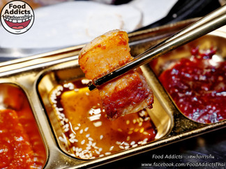 จานต่อไปเราตั้งใจมาทานโดยเฉพาะคือ "หมูสามชั้น Wet Aged" ราคา 290 บาท เป็นหมูสามชั้น 3 ชิ้นใหญ่-หนาพร้อมตัดแต่งโดยการลอกหนังแข็งออกให้เรียบร้อยก่อนนำไปผ่านกระบวนการ Wet Aged ก็คือการบรรจุเนื้อหมูลงในถุงสุญญากาศก่อนจะนำไปแช่น้ำเย็นตามอุณหภูมิที่กำหนดช่วยเพิ่มความนุ่มและกลิ่นสาบเฉพาะตัวของหมูเบาลง ตามมาด้วย "สันคอหมูหมักซอสดำ" ราคา 290 บาท เป็นสันคอหมูหั่นหนาชิ้นใหญ่เอาไปหมักกับซีอิ๊วเกาหลีปรุงรสพิเศษสูตรของทางร้านจนเข้าเนื้อฟังแล้วก็เหมือนกับร้านอื่นๆ แต่ถ้าลองสังเกตดีๆแล้วจะมีสีสันค่อนข้างอ่อนและไม่มีน้ำไหลนองเต็มจานส่วนรสชาตินั้นเดี๋ยวค่อยมาชิมกันครับ เมนูบาร์บีคิวจานสุดท้ายคือ "สันคอหมูหมักซอสแดง" ราคา 290 บาท เป็นสันคอหมูชิ้นหนาแบบเดียวกับจานก่อนเอาไปหมักซอสโคชูจังสีแดงสดสุดเข้มข้น เคลือบชิ้นจนไม่เห็นสีที่แท้จริงของหมูเล็ดลอดออกมา โดยเนื้อทั้ง 3 จานมาพร้อมกับหอมหัวใหญ่หั่นชิ้นยักษ์และเห็ดออเร็นจิประทับตราสัญลักษณ์ร้านจากนั้นน้องพนักงานก็จะเริ่มลงเตาและตะแกรงพักให้ทันที ซึ่งระบบเตาย่างที่ทางร้านใช้เป็นแบบไฟฟ้านำเข้าจากประเทศเกาหลี ด้านล่างหล่อด้วยน้ำสำหรับรองรับไขมันร้อนเร็วทันใจและน้องพนักงานเป็นคนย่างให้จนกว่าจะพร้อมทาน เริ่มต้นด้วยการเปิดเตา/ใช้เทอร์โมมิเตอร์วัดอุณหภูมิ 200 องศาก็พร้อมย่างแล้วครับ