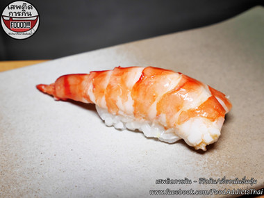 เมนูต่อไปใช้วัตถุดิบราคาแพงคุณภาพสูงที่ไม่ค่อยเสิร์ฟในร้านซูชิทั่วไปคือ "Kuruma Ebi" หรือกุ้งลายเสือนำเข้าจากประเทศญี่ปุ่นเป็นตัวขนาดใหญ่โตเต็มวัย โดยก่อนนำเป็นนิกิริซูชิทางเชฟได้นำไปต้มด้วยกระบวนการพิเศษทำให้เนื้อแน่นเด้งสู้กรามทุกครั้งเมื่อฟันกระทบกับตัวกุ้ง น้ำเนื้อกุ้งหอมตามธรรมชาติผสมกับความหวานของข้าวซูชิที่ถูกปาดด้วยวาซาบิสดคุณภาพสูงจุดบนสุดทาโชยุบางๆแค่พอให้ดึงรสชาติของกุ้งออกมาได้ดียิ่งขึ้น ส่วนตัวผมเคยทานกุ้งลายเสือของไทยบอกได้เลยว่าเนื้อเด้งพอๆกันแต่ความฉ่ำของญี่ปุ่นนี่กินขาด ถือเป็นอีกหนึ่งวัตถุดิบที่ควรค่าแก่การมาทานครับ เมนูต่อมาเป็นวัตถุดิบราคาไม่แพงแต่หาทานอร่อยได้ยากคือ "Aji" หรือปลาสีกุนที่ร้านนี้ใช้เกรดนำเข้าจากประเทศญี่ปุ่น (หลายๆร้านที่เคยทานมาส่วนใหญ่เป็นปลาในไทย) จึงทำให้ได้ความแตกต่างก็คือปริมาณไขมันในชั้นเนื้อที่แน่นและเนื้อเด้งสู้ฟันกว่าเนื่องจากกระแสน้ำที่รุนแรงและเย็นจัดของประเทศญี่ปุ่น เชฟนำมาแล่/ลอกหนังออกวางบนซูชิเสิร์ฟแบบนิกิริทาด้านบนบางๆด้วยโชยุ ท๊อบปิ้งด้วยขิงสดขูดอีกเล็กน้อยพร้อมเสิร์ฟแบบไม่ต้องผ่านกระบวนการปรุงหรือบ่มอะไรมากมายก็สามารถสัมผัสความอร่อยของเนื้อปลาอาจิได้อย่างเต็มคำ ทั้งหวานมันเด้งสู้ฟันฉ่ำไขมันปลาผสมกับข้าวซูชินุ่มๆปั้นมาเรียงเมล็ดหอมขิงสดขูดช่วยกำจัดกลิ่นคาวในปากอย่างหมดจดครับ