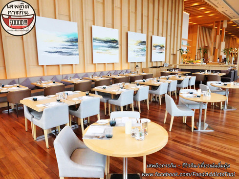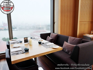 บรรยากาศในห้องอาหารตกแต่งด้วยลายไม้โทนสีสว่าง (ทั้งพื้นและผนังของทางโรงแรม) รวมถึงเฟอร์นิเจอร์ที่ใช้ก็เป็นไม้บุเบาะนวมสีอ่อนสบายตา ใช้ไฟสีส้มทำให้รู้สึกอบอุ่น มุมที่ติดกับแม่น้ำเจ้าพระยาเป็นกระจกทั้งหมด เพื่อให้ทุกคนที่นั่งทานในห้องนี้สามารถชมวิวแม่น้ำเจ้าพระยาได้อย่างทั่วถึง จากมุมนี้สามารถเห็นทั้งแม่น้ำเจ้าพระยาและสะพานพระราม 3 หรือสะพานกรุงเทพฯได้อย่างชัดเจน แต่น่าเสียดายวันนี้ที่ฝนตกทำให้กระจกค่อนข้างมัวไปนิดนึง มาถึงเราก็ทำการวางของต่างๆไว้ที่โต๊ะ แล้วก็ได้เวลาเดินไปสำรวจที่ไลน์อาหารกันแล้วครับ ว่ามีอะไรให้เราทานบ้าง