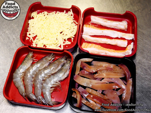 ตามมาด้วย "ชีส" ทางร้านใช้มอสซาเรลล่าของแท้เคี้ยวเหนียวหนึบคล้ายหมากฝรั่งซึ่งแตกต่างจากของปลอมๆตามบุฟเฟ่ต์ราคาถูกทั่วไปที่มักจะมีเปอร์เซ็นต์ไขมันปาล์มสูงกว่านมวัวจึงเข้มข้นไม่เท่ากัน / "ท้องปลาแซลมอน" หั่นเอาส่วนครีบแข็งออกเหลือแต่พุงติดหนังและเนื้อสีส้มแทรกชั้นไขมันสวยงามชวนย่างกรุบกรอบเข้ากับน้ำจิ้มซีฟู้ดสุดแซ่บได้อย่างลงตัว / "กุ้งสด" เลือกเฉพาะตัวใหญ่เนื้อแน่นไม่แบ่งเกรดว่าจะกินแบบบุฟเฟ่ต์หรือ A La Carte แต่ก็จำกัดให้สั่งไม่เกินครั้งละ 5 ถาดซึ่งส่วนตัวถูกใจมากๆครับ / "ปลาหมึกกรอบ" กับ "แมงกะพรุน" หั่นเสิร์ฟชิ้นหนาๆเคี้ยวกรุบกรอบเต็มคำเมื่อย่างหรือลงต้มในหม้อน้ำซุปชาบูแล้วไม่ละลายหายไป / "ปลาหมึกสด" ใช้ตัวขนาดกลางๆล้าง-ทำความสะอาดจนไม่มีกลิ่นเหม็นหืนเอาแกนพร้อมดวงตาออกให้พร้อมกินและเมื่อผ่านความร้อนแล้วไม่หดตัวเล็กจนน่าเกลียดเกินไป / "เนื้อปลาสด" ใช้แพนกาเซียสดอรี่แช่แข็งทำละลายพร้อมหั่นเป็นชิ้นใหญ่ๆก่อนจัดลงใส่ในถาด / "หอยแมลงภู่" เลือกสายพันธุ์ชิลีตัวเล็กแต่เนื้อมันอัดแน่นเต็มฝาคุณภาพสูงเกินราคาบุฟเฟ่ต์ไปมากแล้วครับ