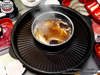เนื่องจากการใช้เตาอั้งโล่ใส่ถ่านไม้รองไว้ด้านล่างจึงกระจายความร้อนได้ดีตั้งแต่จุดกลางหม้อจนถึงขอบกระทะช่วยให้น้ำซุปเดือดไวมากๆ อีกทั้งยังเคลือบสารกันติดจึงย่างง่ายไม่ติดกระทะเลยไม่ต้องขอเปลี่ยนบ่อยให้เสียจังหวะความอร่อย จัดการวางวัตถุดิบทุกอย่างที่เราสั่งมาเรียงลงไปทั้งเนื้อหมู/เนื้อวัว/ซีฟู้ด/ลูกชิ้นต่างๆและสำหรับชีสทางร้านมีถ้วยอะลูมิเนียมขนาดจิ๋วให้ใส่หรือโรยลงไปในกระทะทำเป็น "หมูย่างห่มมอสซาเรลล่าชีส" สไตล์เกาหลีซึ่งตอนนี้กำลังได้รับความนิยมก็ได้ (เพราะกระทะเคลือบด้วยเทฟลอนอยู่แล้ว) สำหรับน้ำซุปสุกี้ยากี้เนื่องจากทำสูตรเข้มข้นพิเศษรสชาติหวานนำเค็มกลมกล่อมหอมกลิ่นสาหร่ายคอมบุและปลาคัตสึโอะตากแห้งคล้ายๆภัตตาคารญี่ปุ่นชั้นนำ น้องพนักงานจึงแนะนำให้ปรับความเบาบางลงด้วยซุปกระดูกหมูด้วยตนเองเพราะเตาถ่านไฟแรงมากจนอาจจะรู้สึกเค็มจัดเมื่อนั่งทานนานๆ เนื้อสัตว์สไตล์บางเอามาลวกในหม้อกินแบบชาบูแต่มีข้อควรระวังอีกเล็กน้อยก็คือ "อย่าจิ้มไข่ดิบ" เพราะไม่ใช่เกรดทานได้สดๆจึงไม่อยากแนะนำอย่างยิ่ง ส่วนหมู,เนื้อวัวที่หั่นชิ้นหนาๆก็เอาลงย่างให้เกรียมสุกกรอบพร้อมพักไว้ในจานแล้วเตรียมมาอร่อยกับวิธีการซึ่งจะช่วยให้บุฟเฟ่ต์ปิ้งย่าง,สุกี้มื้อนี้พิเศษมากขึ้นกว่าเดิมครับ