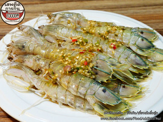 ปูม้าดองน้ำปลาถูกยกออกมาเรียงก่อนเป็นอันดับแรก เนื้อสีขาวสวยงาม บางตัวมีไข่สีส้มอัดแน่นเห็ดชัด (ตอนสั่งสามารถเลือกได้นะว่าจะกินปูเนื้อหรือปูไข่) ราดด้วยซอสน้ำปลากลิ่นหอมๆแบบฉ่ำๆ เหมือนปรุงรสน้ำดองให้กลิ่นลดลงและรสกลมกล่อมมากขึ้น ไม่ได้เหม็นแตะจมูกจนไม่น่าซื้อทาน กุ้งสดที่นี่แกะเปลือกกุ้งดึงเส้นดำตรงกลางหลังจนเหลือแต่เนื้อสีขาวติดปลายหางนิดๆ ก็ถูกจับราดซอสน้ำปลาสูตรพิเศษของทางร้านเพื่อรอเตรียมการขายเช่นกัน เรียกได้ว่ารอไปกลืนน้ำลายไปเลย ใครที่ห่วงเรื่องสุขอนามัยว่าเป็นร้านข้างทางในตลาดแบบนี้จะสะอาดมั้ย? ส่วนตัวสังเกตมาให้ทุกขั้นตอน หากต้องสัมผัสอาหารจะมีการการสวมถุงมือยางอยู่เสมอ ทำให้รู้สึกอยากทานขึ้นไปอีกครับ