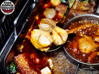 มาทานหม้อไฟหม่าล่าแบบนี้สิ่งที่ขาดไม่ได้เลยก็คือ "ลูกชิ้นรวมไต้หวัน 6 ลูก" ราคา 320 บาท เป็นลูกชิ้นขนาดใหญ่พิเศษสไตล์ไต้หวันแท้ๆประกอบไปด้วยลูกชิ้นปลาหมึก/ลูกชิ้นกุ้งและลูกชิ้นเนื้อไซส์จัมโบ้ เนื้อสัมผัสแน่นบีบรัดตัวพร้อมระเบิดในปากต้มนานๆไม่อืดพองเพราะไม่ผสมแป้งกัดลงไปเจอแต่เนื้อเน้นๆเคี้ยวเต็มคำสะใจ สั่งมาอีกจานเป็น "ฟองเต้าหู้ทอด" เสิร์ฟ 4 ชิ้นม้วนใหญ่แบบนี้ ราคา 80 บาท มันก็คือฟองเต้าหู้ทอดแบบจีนที่เอามาม้วนสำหรับต้มลงในหม้อหม่าล่าให้ดูดซึมน้ำซุปเข้าไปภายในกัดแล้วชุ่มฉ่ำเต็มปาก จานต่อมาเราไม่ได้สั่งแต่ทางร้านยกออกมาให้ฟรีขอบคุณที่เราแวะเข้ามาทานเพราะเพิ่งเปิดได้ไม่นานก็คือ "ไก่ทอดพริกเสฉวน" ปกติจานละ 195 บาท เป็นเนื้อไก่ชุบแป้งทอดสูตรพิเศษกรอบทนนานเอาไปคั่วกับพริกแห้งและเมล็ดซวงเจียทอดรสเผ็ดร้อนชาลิ้นเค็มเบาๆทานเพลินกลมกล่อมก่อนจะโรยต้นหอมกับงาขาวลงไป ตอนแรกคิดว่าถ้าไม่ทานโดนเครื่องสมุนไพรคงไม่เผ็ดเท่าไหร่แต่เขาคั่วจนน้ำมันเครื่องเทศซึมเข้าไปในแป้ง-เนื้อไก่เรียบร้อยแล้วยังไงก็เผ็ดฉุนโดนทุกคำแน่นอนเป็นอีกจานที่ประทับใจครับ