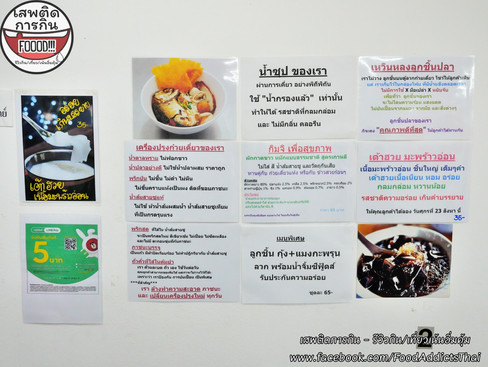 ก๋วยเตี๋ยวของที่ร้านนี้มีต้มยำมะนาวสด/เย็นตาโฟ/เย็นตาโฟต้มยำ/น้ำใส เส้นมีเป็นเส้นใหญ่/เส้นเล็ก/เส้นหมี่/บะหมี่/มาม่า/วุ้นเส้น/เกี้ยมอี๋ ธรรมดา 50 (ต้มยำเริ่ม 55 บาท) พิเศษ 60 บาท ราคาเกาเหลา 50 บาท (ต่างจากที่อื่นเกาเหลาราคามักจะแพงกว่าธรรมดาเสมอ) ลูกชิ้นปลา/ลูกชิ้นกุ้ง/เกี๊ยวปลาใหญ่ ลูกละ 4 บาท ลูกชิ้นกุ้งแมงกระพรุนลูกละ 12 บาท (อันนี้ราคาโหดแต่ไม่เคยเห็นที่ไหน เดี๋ยวลองสั่งมาทาน) ฮือกวยเส้นละ 70 บาท หนังปลาและเกี๊ยวทอดอย่างละ 20 บาท เท่าที่ดูแล้วอาหารของที่ร้านนี้มีเรื่องราวทุกเมนู แปะเอาไว้เต็มผนังร้าน ก็อ่านกันเองนะครับ เพราะว่ามีเยอะมากๆกลัวว่าจะค่อนข้างยืดยาวเกินไปหน่อย แต่แสดงถึงความใส่ใจของเจ้าของร้านดีเลยครับ