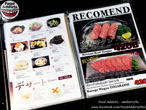 เมนูถัดไปถูกวางแผ่นทองคำเปลวด้านบนดูหรูหราและพรีเมี่ยมเพราะเป็นเนื้อวากิวส่วนพิเศษอยู่นอกเล่มเมนูซึ่งวันที่เรามาทางร้านกำลังจัดโปรโมชั่นอยู่นั่นก็คือ "Tokujyo Karubi" ปกติราคาเต็ม 680 บาท ลดเหลือ 650 บาท ชิ้นส่วนซี่โครงคุณภาพดี-รสชาติเข้มข้นชั้นไขมันแทรกตัวราวกับหินอ่อนละเอียดที่สุดมีเพียงชิ้นเล็กๆในหนึ่งก้อนเนื้อนำมาแล่ชิ้นหนาขนาดพอดีคำ โดยน้องพนักงานแนะนำว่าให้ย่างบนเตาพอสุกประมาณ 60-70% แล้วจิ้มเกลือผสมพริกไทยดำจึงจะได้รับความอร่อยระดับสูงสุด อีกจานเหมาะสำหรับคนชอบเนื้อไขมันน้อยพอสวยงามแต่นุ่ม,รสชาติเต็มเปี่ยมซึ่งมีจำหน่ายจำนวนจำกัดต่อวันหั่นชิ้นหนาชวนเคี้ยวเต็มคำเรียงใส่จานมาอย่างสวยงามนั่นก็คือ "Kuroge Wagyu Togarashi" ปกติราคาเต็ม 480 บาท ลดเหลือ 420 บาท โดยเนื้อวากิวส่วนพิเศษเหล่านี้จะถูกนำเข้ามาจากประเทศญี่ปุ่นต่างกันในแต่ละวันต้องคอยสอบถามน้องพนักงานอยู่เรื่อยๆครับ นอกนั้นก็ได้สั่งอาหารทานเล่นอีกหลายรายการเริ่มต้นกันด้วย "Wagyu Yukke" หรือยำเนื้อวากิวดิบสไตล์ญี่ปุ่นราคา 380 บาท จุดเด่นของชามนี้ที่ต่างจากร้านอื่นๆนั่นก็คือใช้เนื้อวัววากิวแทรกไขมันลายหินอ่อนหั่นเป็นเส้นแนวยาวคลุกลงในน้ำยำสูตรเฉพาะรสชาติหวาน-เผ็ดอมเปรี้ยวเพิ่มความนัวด้วยไข่แดงสด/งาขาว/ต้นหอมซอยเคล้าให้เข้ากันก่อนนำเข้าปากคือฟินขั้นสุดครับ